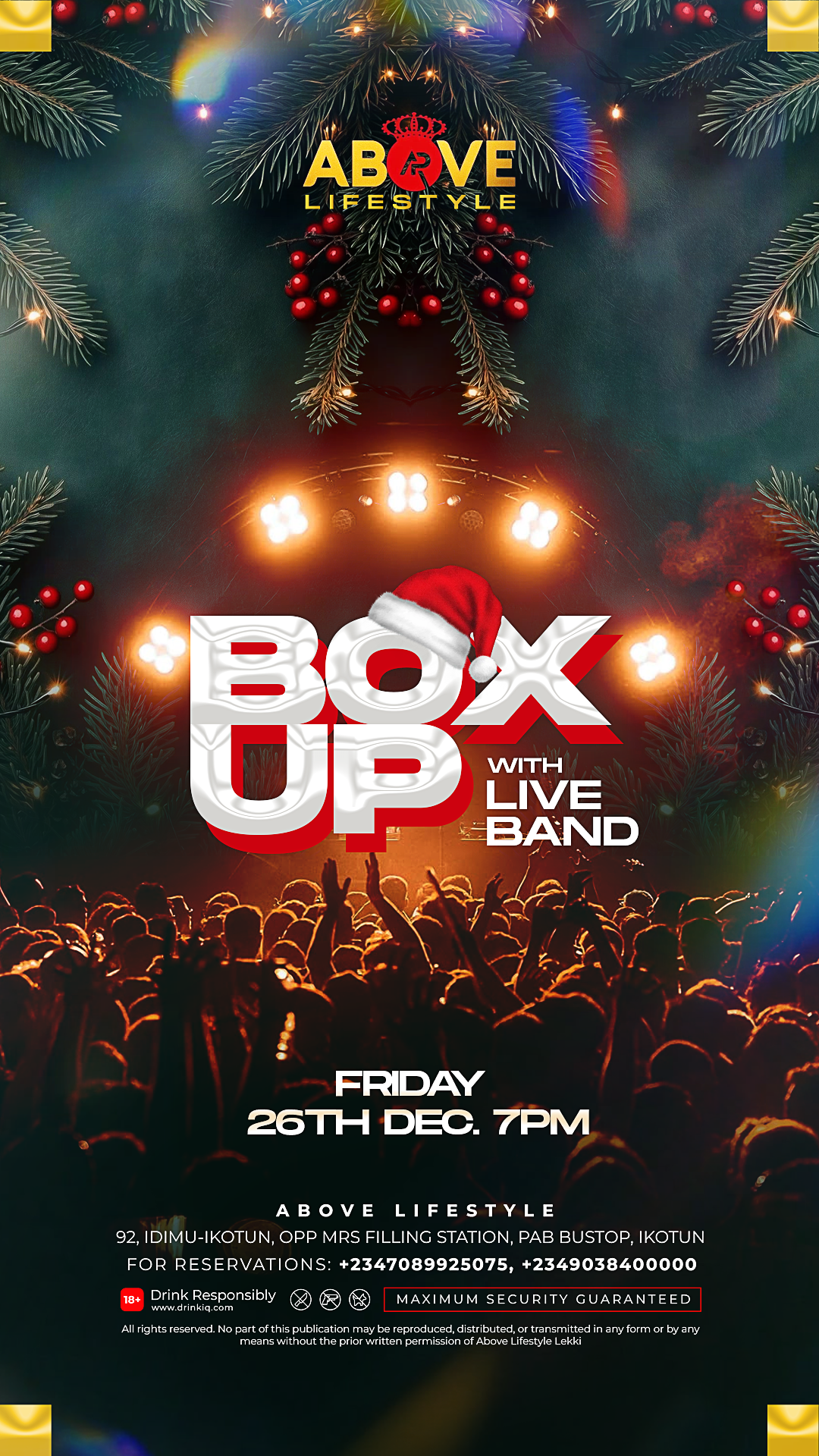 Box Up with Live Band at Above Lifestyle — where Lagos experiences live music in ultimate luxury. Electrifying performances, top-tier DJs, premium bottles, dazzling lights, and an elite crowd come together for a night of unforgettable music, style, and energy.