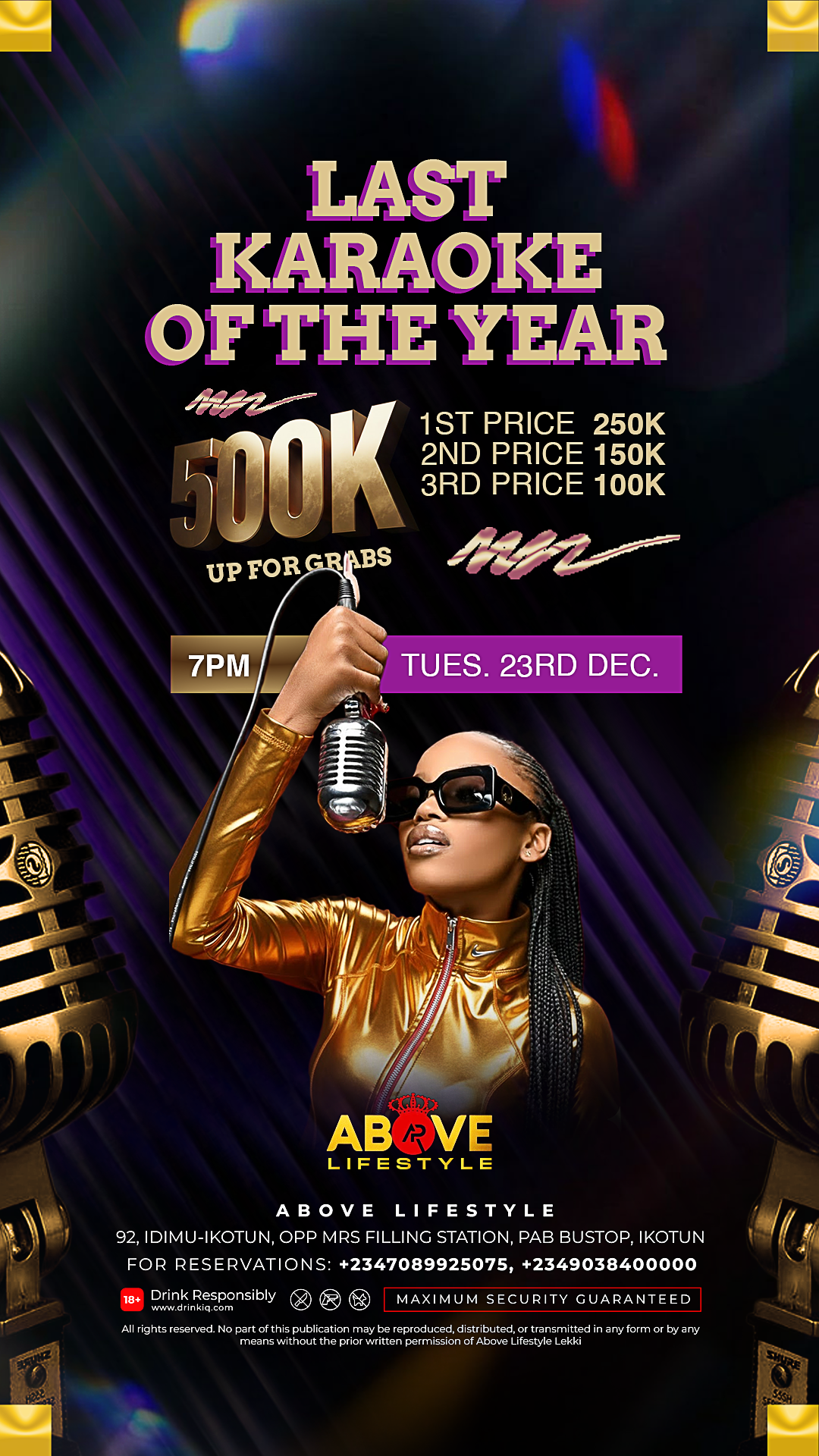 Last Karaoke of the Year at Above Lifestyle — where Lagos closes the year in pure style. A vibrant night of music, premium vibes, dazzling lights, and an elite crowd ready to sing, celebrate, and create unforgettable memories. It’s the ultimate year-end karaoke experience for the city’s trendsetters and tastemakers.