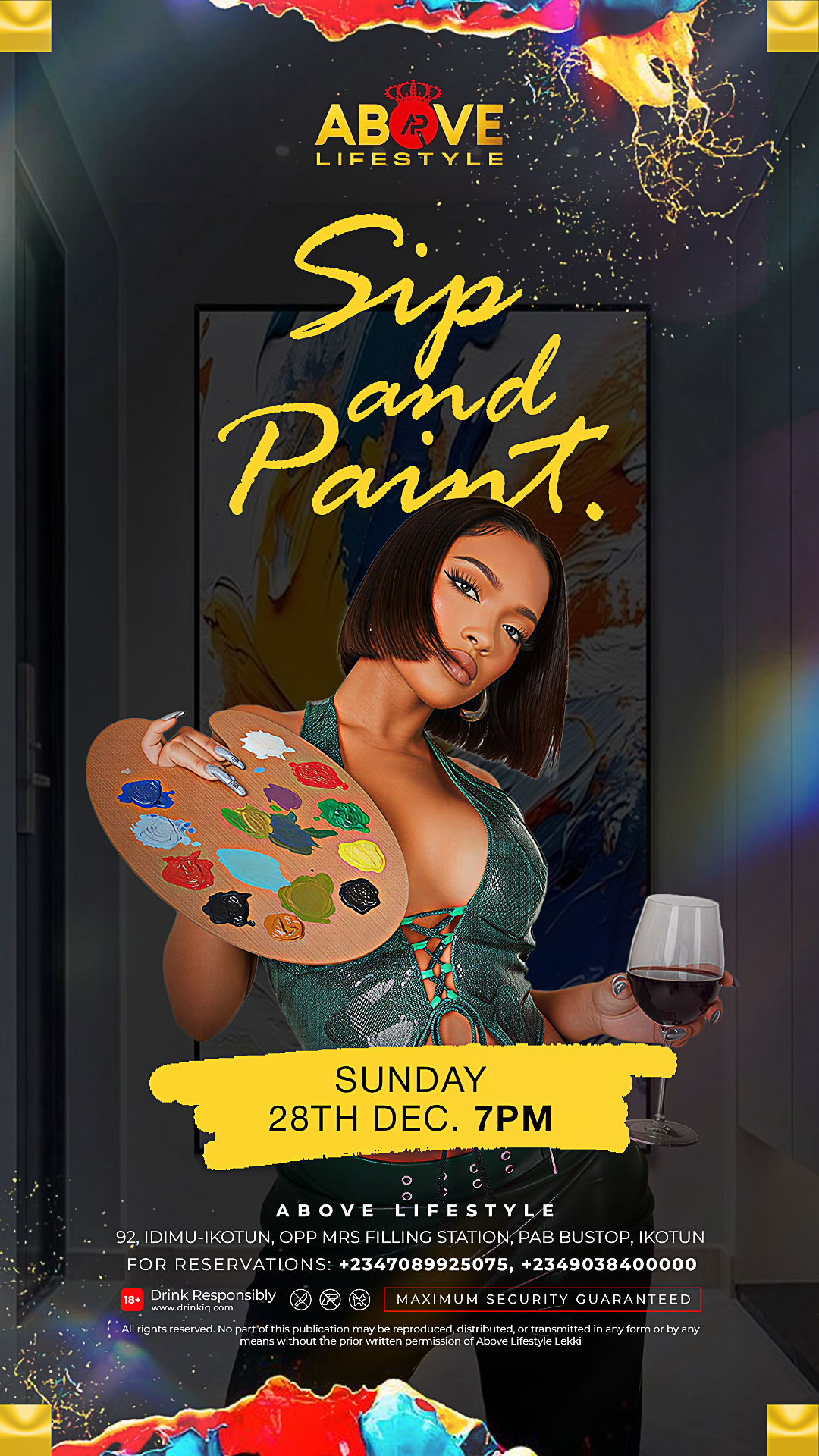 Sip and Paint at Above Lifestyle — where Lagos blends creativity with luxury, elegance, and vibrant energy seamlessly. Sophisticated vibes, premium drinks, vibrant colors, and an elegant crowd come together for an unforgettable evening of art, style, and indulgence.