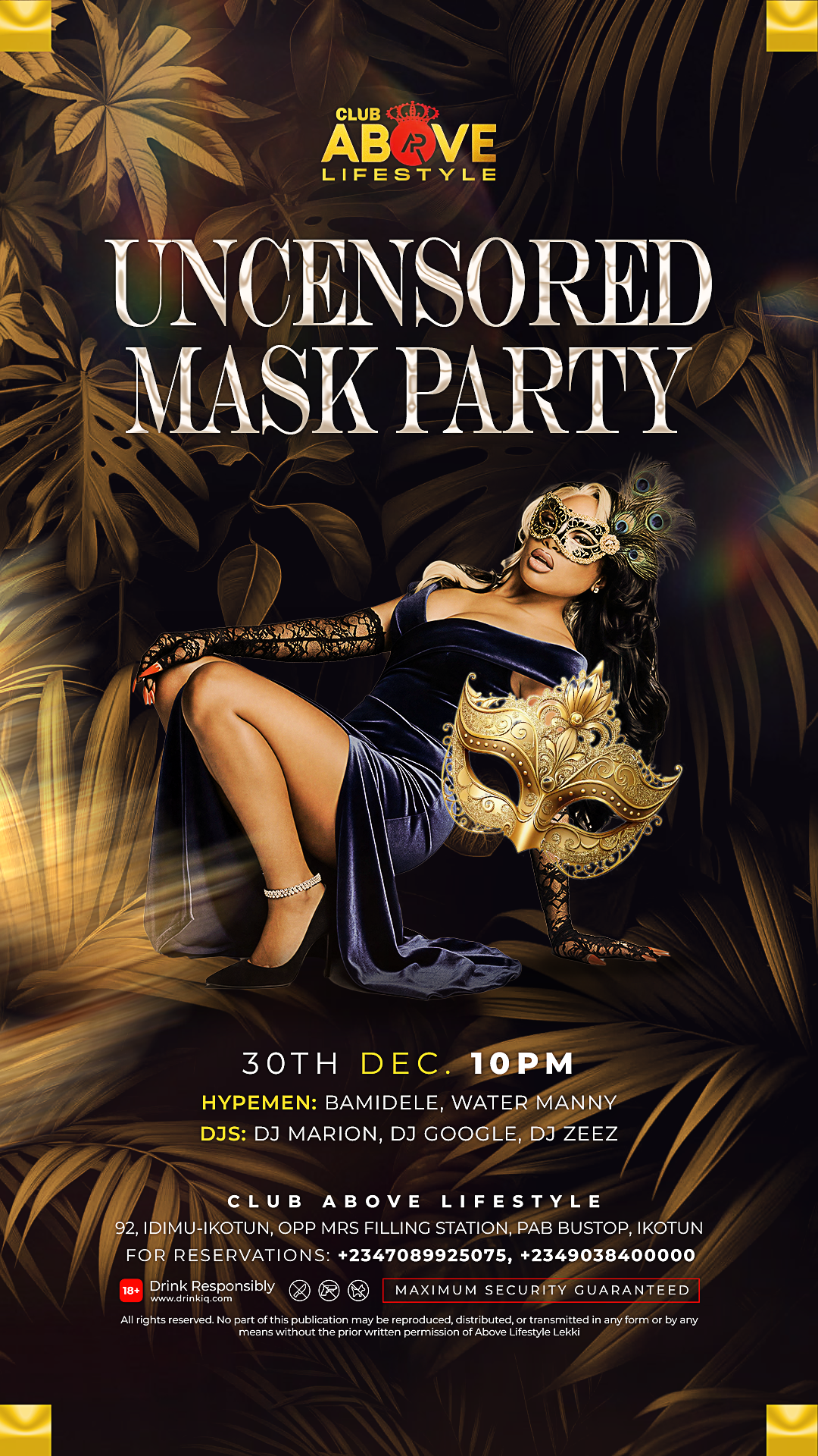 Uncensored Mask Party at Above Lifestyle — where Lagos nightlife meets ultimate luxury. Top DJs, premium bottles, dazzling lights, and a stunning masked crowd come together for a night of mystery, music, and vibes. Sophistication and energy make this the city’s most glamorous.
