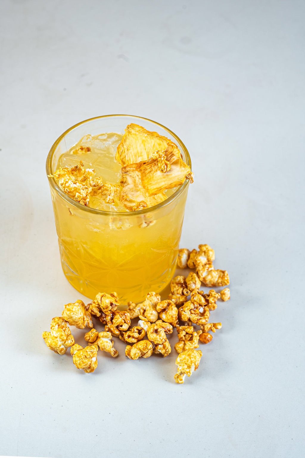 Popcorn syrup,pineapple juice,orange juice,soda water, popcorn