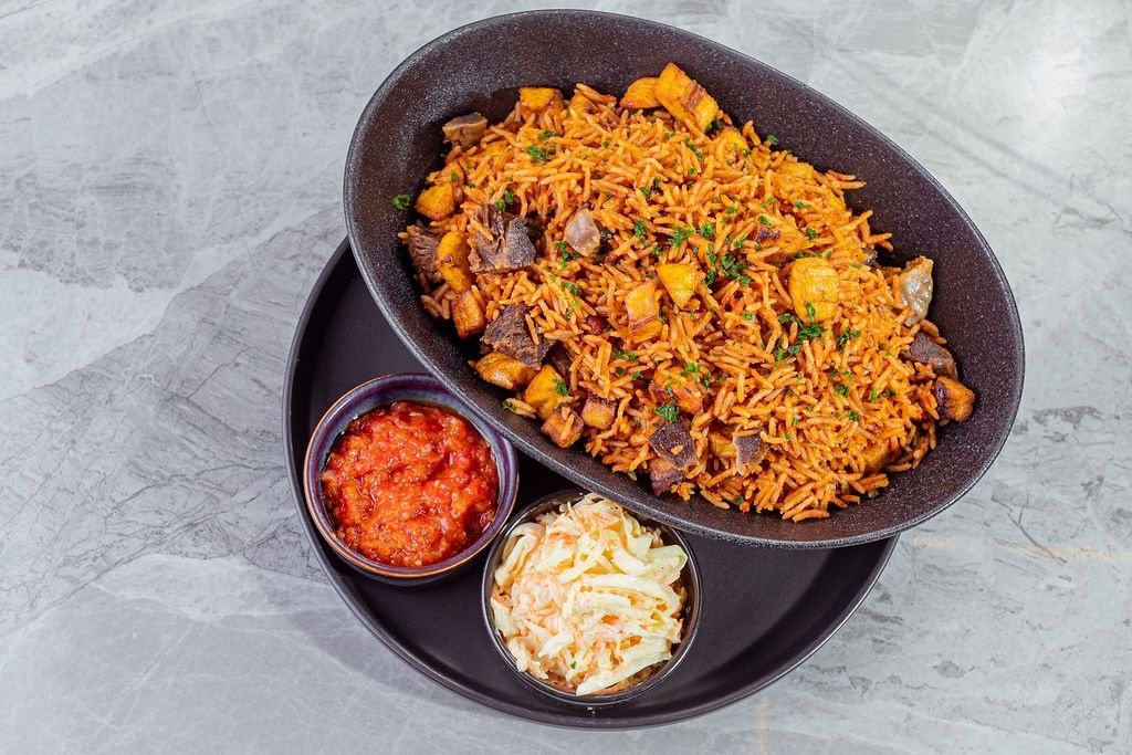 Smokey clay pot jollof with goat pieces, plantain gizzard etc