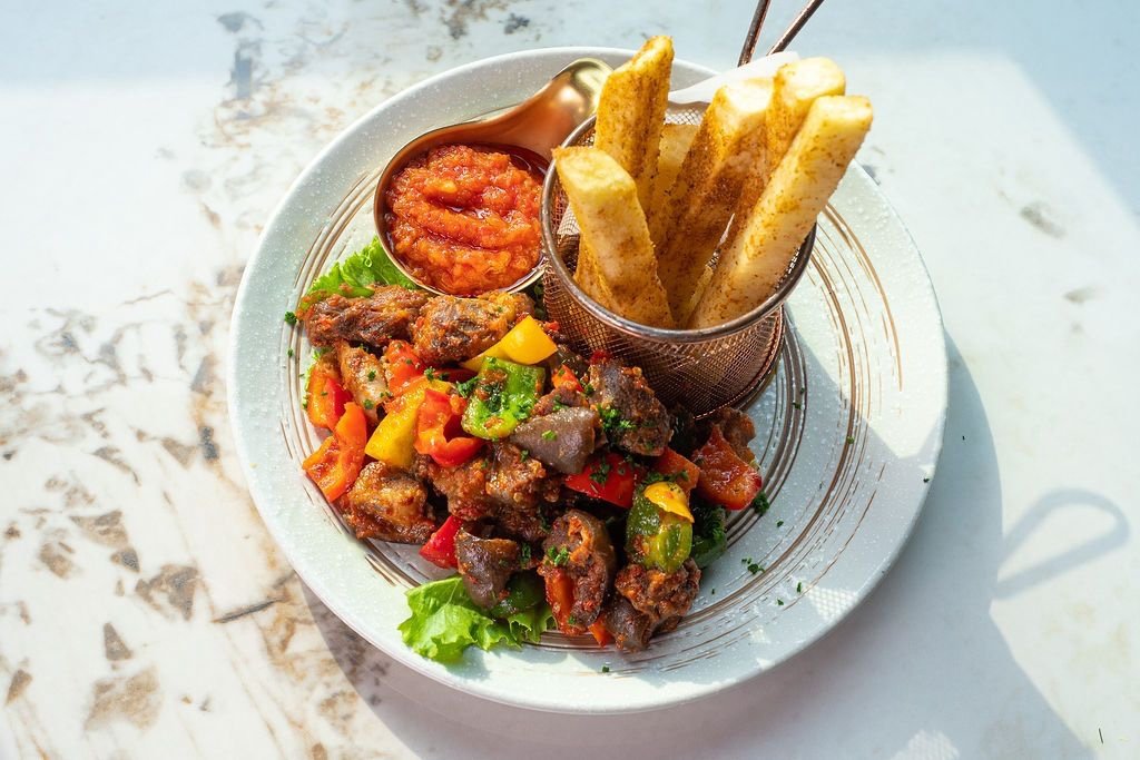 Peppered butterfly snails with yam fries